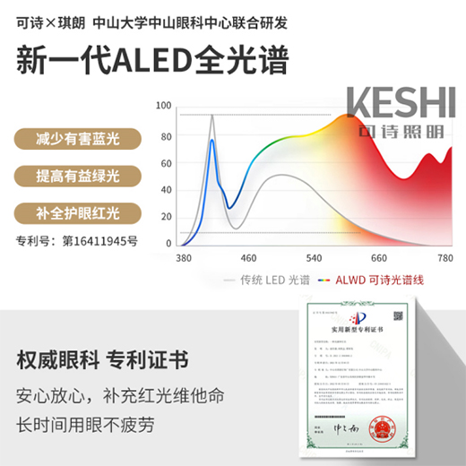 ALED全光譜護眼吸頂燈的最大優(yōu)勢,早已展現(xiàn)在命名之中,那便是ALED全光譜護眼。此護眼技術(shù)是與中山大學(xué)中山眼科中心共同研發(fā),主要通過大幅度減少有害藍光,提升有益綠光,補全紅光含量,模擬出與太陽光相似的全光譜,來打造出更健康護眼的光環(huán)境。該護眼技術(shù)已獲得實用新型專利證書認(rèn)證,帶有權(quán)威專業(yè)機構(gòu)背書,給足消費者安全感。