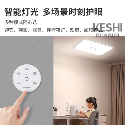 據(jù)照明工程學(xué)報《光與健康的研究動態(tài)與應(yīng)用前景》所言,不同燈光色溫使人產(chǎn)生不同的情緒,進而影響人的學(xué)習(xí)活動效率。傳統(tǒng)的吸頂燈在調(diào)節(jié)燈光色溫亮度上稍有欠缺,但這款A(yù)LED全光譜護眼客廳吸頂燈產(chǎn)品配備遙控器,方便用戶開關(guān)燈及選擇切換不同的燈光模式,包含迎賓、觀影、愜意、歡聚、閱讀、伴行夜燈六種模式,隨心所選,更適應(yīng)日常生活的實際色溫光照需求。