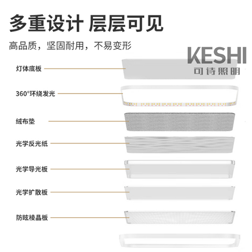 如我們所見,這款產(chǎn)品由多層結(jié)構(gòu)組合而成,包含燈體底板、絨布墊、光學(xué)反光紙、光學(xué)導(dǎo)光板、光學(xué)擴散板及防眩棱晶板,層層組合,堅固耐用,不易變形。再加上360°環(huán)繞發(fā)光設(shè)計,無暗區(qū)更明亮,出光柔和均勻,照明面積更大,在防眩效果上也更有保證。