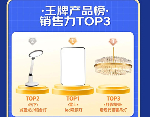 “王牌產(chǎn)品榜·銷售力TOP 3”分別為:雷士LED吸頂燈、松下減藍(lán)光護(hù)眼臺燈、月影凱頓后現(xiàn)代輕奢吊燈;