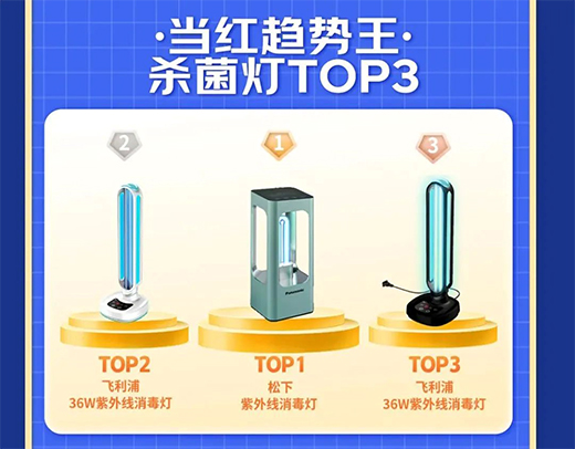 “當(dāng)紅趨勢王·殺菌燈TOP 3”分別為:兩款飛利浦36W紫外線消毒燈以及松下紫外線消毒燈;
