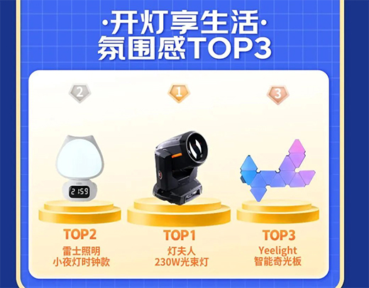“開燈享生活·氛圍感TOP 3”分別為:燈夫人230W光束燈、雷士照明小夜燈時(shí)鐘款、Yeelight智能奇光板。