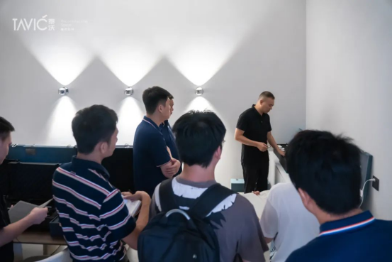 泰沃戰(zhàn)略合作伙伴瑪斯頓影音的詹總為學(xué)員們講解了照明與影音的聯(lián)動,并展示了一套正在研發(fā)中的可與屏幕聯(lián)動的設(shè)備。當識別到播放電影時可自動關(guān)閉窗簾、燈光調(diào)整為觀影模式,屏幕兩側(cè)的燈帶可實現(xiàn)光畫同步。這套設(shè)備為泰沃與瑪斯頓聯(lián)合開發(fā),可在觀看電影等場景時進行聯(lián)動,為用戶帶來更好的體驗。