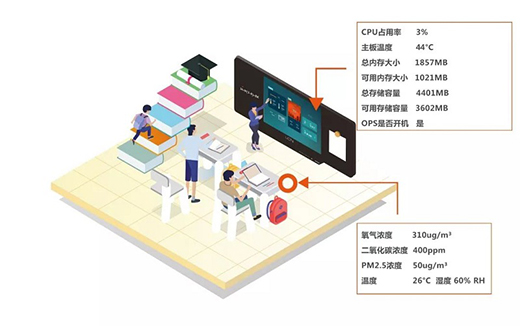 管理員通過(guò)物聯(lián)功能接入環(huán)境監(jiān)測(cè)傳感器后,就可以在小程序上和黑板使用數(shù)據(jù)一起,監(jiān)看環(huán)境信息了。顯示的數(shù)據(jù)包括空氣濕度、溫度、含氧量、PM2.5污染程度等,隨時(shí)掌握學(xué)習(xí)環(huán)境。