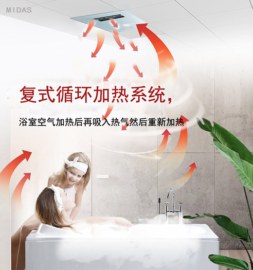 3、復(fù)式循環(huán)加熱系統(tǒng),浴室空氣加熱后再吸入熱氣然后重新加熱,暖風(fēng)內(nèi)循環(huán),高效快速升溫,從頭暖到腳