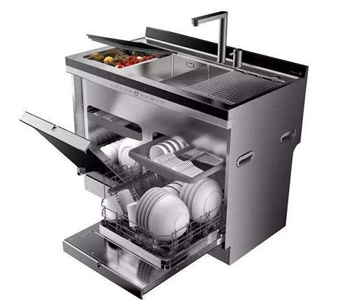 火星人D7洗碗機在功能集成上做到了極致,集齊十大功能于一體??吹靡姷墓δ苡校弘p水槽、可移動切菜臺,果蔬海鮮清洗機,碗柜,洗碗機,而隱形功能則包括瀝水,廚余殘渣處理,軟水處理,余溫烘干,高溫消毒等。這樣一臺洗碗機,所占面積相當于普通雙水槽尺寸的臺面空間,對廚房空間的利用效率更高。