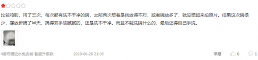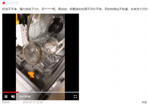 其中,有消費(fèi)者表示“哎洗不干凈,強(qiáng)力洗洗了3次”,在上傳的視頻評(píng)價(jià)中依然可以看到餐具上殘留的污漬,水漬殘留的情況也是部分消費(fèi)者反饋的問題。