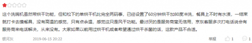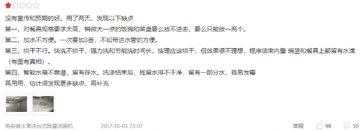但在產(chǎn)品評(píng)價(jià)中,可以看到部分用戶對(duì)于烘干功能的表現(xiàn)并不滿意,主要是存在程序結(jié)束后,餐具上仍然殘留水滴等情況。