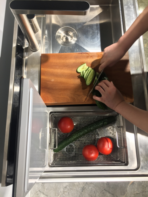 火星人D7集成洗碗機(jī)將眾多廚房物件通過一臺(tái)機(jī)器進(jìn)行集成,通過水槽上的復(fù)式“小臺(tái)階”擴(kuò)大空間利用率,在做飯時(shí),站在原地不動(dòng)就能夠?qū)⑾床?、瀝水、切菜、裝盤等步驟一氣呵成的完成。