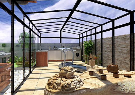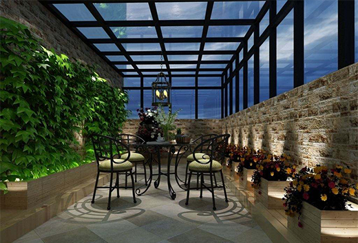 陽光房以親近陽光為主,它連接著室內(nèi)外的空間,因此既要和室外空間自然和諧,又與居室內(nèi)的整體風(fēng)格相吻合,達(dá)到過渡的作用。