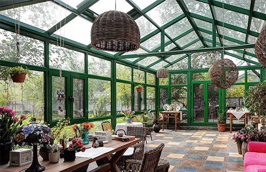 陽(yáng)光房就是一個(gè)大溫室,若在墻角一處,種植一些綠植花卉,更能陶冶日常心情。一個(gè)完全通透的空間,陽(yáng)光肆意穿透,白天不需要開(kāi)燈;到了晚上,也是一種別樣的美景:看看外面的燈火闌珊,躺在躺椅上數(shù)著夜空的星星。