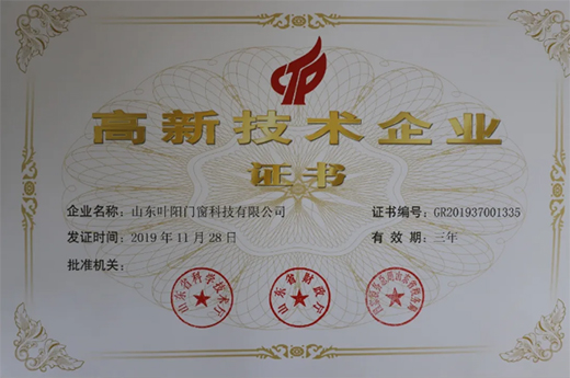 經(jīng)國家專家團評審,2019年11月,葉陽陽光房榮獲山東省科學(xué)技術(shù)廳 山東省財政廳 國家稅務(wù)總局山東省稅務(wù)局聯(lián)合頒發(fā)的《高新技術(shù)企業(yè)證書》。