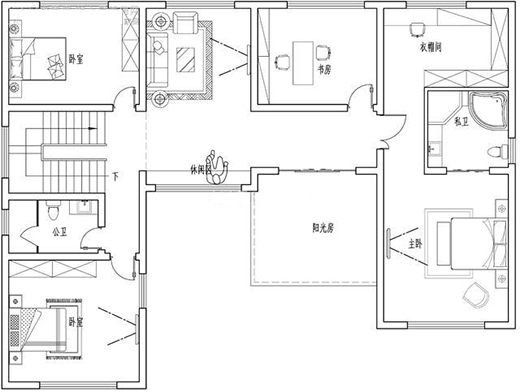 二層以居住休閑為主,整層設(shè)置3間臥室,其中東側(cè)設(shè)置為主臥套房;中部向外延伸出陽光房空間,可供業(yè)主及其家人休閑使用。