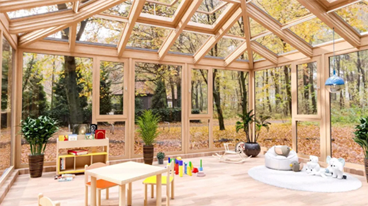 陽(yáng)臺(tái)做成陽(yáng)光房后,可配以童車和電動(dòng)玩具等器材,孩子嬉戲于“兒童樂園”之中,健康快樂中成長(zhǎng)。無(wú)論春夏秋冬,天氣季節(jié)變換,再也不用擔(dān)心孩子沒有足夠的空間玩耍了。