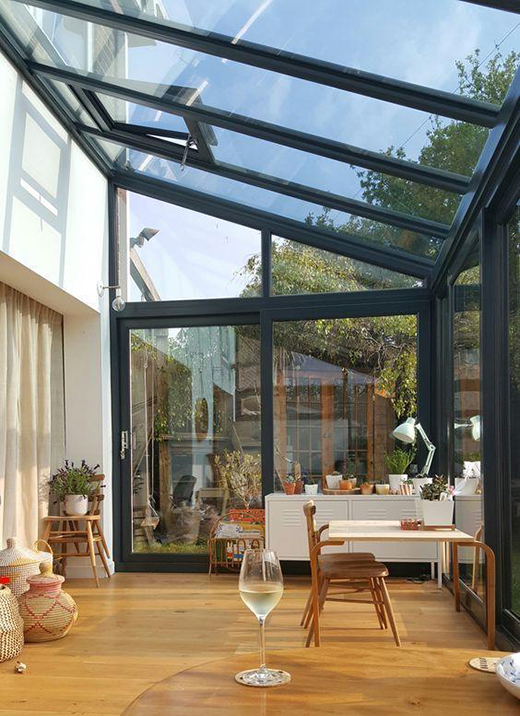 斜頂陽光房利用直立支撐框架與斜平頂配合而成,相比平頂陽光房,排水性能強一些,適合區(qū)域同樣是公寓無頂陽臺,別墅底層。