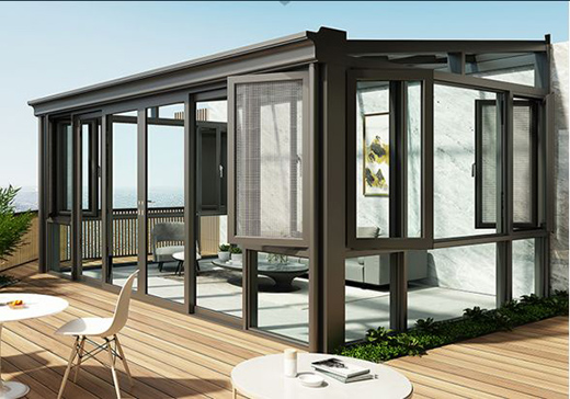 陽光房垂直面的處理,通常是采用各種形式的窗或門加以封裝,在陽光房的維護(hù)結(jié)構(gòu)的設(shè)計中,應(yīng)著重考慮的是陽光房的功能,比如觀景陽光房可在陽光房維護(hù)結(jié)構(gòu)中使用無框窗,視線更為通透、無遮擋,而暖房式陽光房則更考慮其保溫、隔熱、節(jié)能、環(huán)保,可采用斷橋鋁門窗。