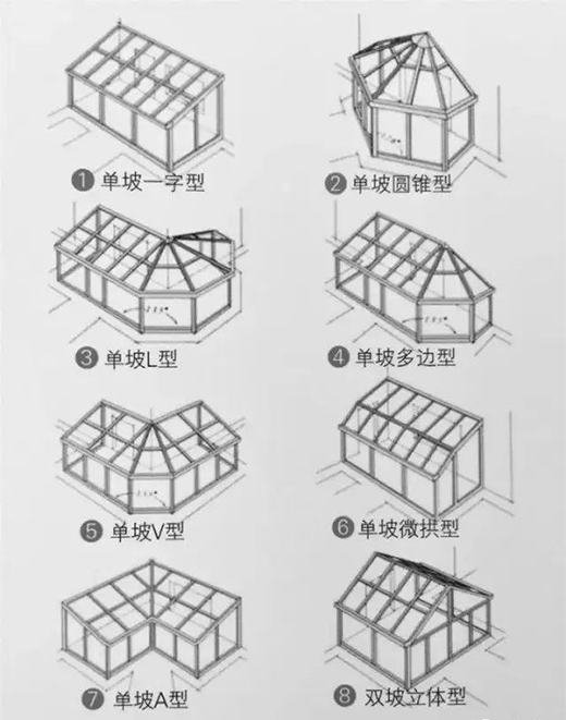 一般,用于庭前或露臺的為單坡一字型,可以很好的依附于垂直的墻面。而在墻體拐角處的可以建成L型或V型。