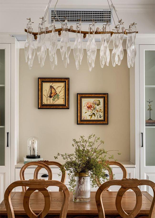 復(fù)古的掛畫烘托出空間整體的主旋律,畫里的自然感被潛移默化的帶進(jìn)用餐空間,開啟了印象中的山水之美。