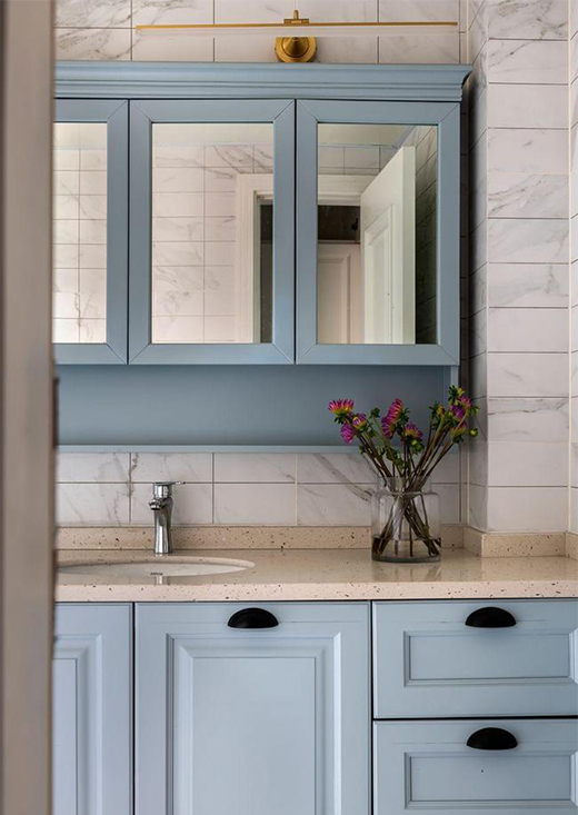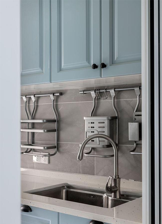 櫥柜的霧霾藍(lán),在空間顯得低調(diào)又不突兀,配合金屬質(zhì)感的廚具,讓業(yè)主擁有美好的烹飪時(shí)光。