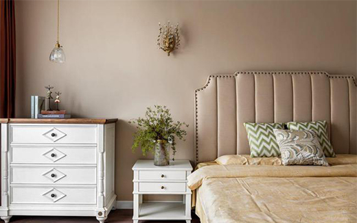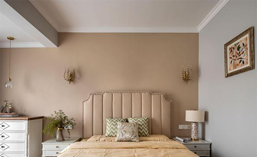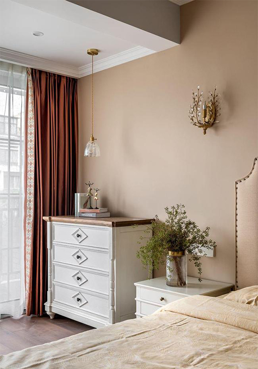 優(yōu)雅溫暖的主臥擁有利落的線條和清爽的色彩,空間布局簡(jiǎn)潔。無(wú)論是吊燈,還是地板,都沒有瑣碎的設(shè)計(jì)。設(shè)計(jì)師把外陽(yáng)臺(tái)拉進(jìn)房間,增大了主臥的面積。奶茶色調(diào)呼應(yīng)客廳,柔滑質(zhì)感的絲綢床品、黃銅的燈飾、花香的點(diǎn)綴,將空間曼妙輕盈的舒適感詮釋到了極致。