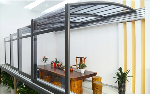 而新型移動陽光房選擇的材料則沒有這方面問題,鋁合金骨架加聚碳酸脂板可定制范圍很大,平頂、人字頂、弧形頂?shù)榷喾N造型都能滿足。