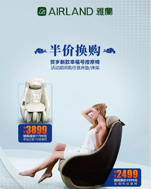 雅蘭“賞新?悅夢”新年賀歲大促火熱進(jìn)行中,即日起至2020年1月12日,成交雅蘭任意床墊/床架后,僅需2499元即可換購原價4999元幸福1號按摩椅;僅需3899元即可換購原價7799元幸福全能1號按摩椅。