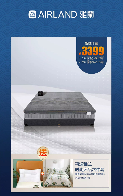這個冬天,用【智暖】再也不用擔(dān)心爸媽和孩子睡覺著涼了。孝順父母用【智暖】,活動期間僅需3399元即可擁有,同時免費(fèi)獲贈雅蘭時尚床品六件套。