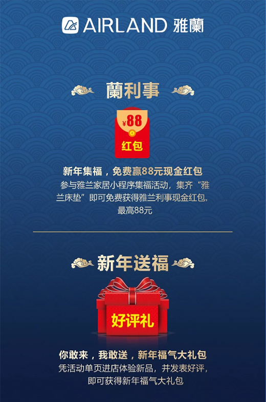 愜意的事很多。老鐵,在這個辭舊迎新的時刻,請關(guān)注雅蘭新年活動,加入集福小程序免費(fèi)獲贈雅蘭利事現(xiàn)金紅包。請來雅蘭全國各門店體驗(yàn)國寶系列新品,在朋友圈發(fā)表你的熱評即可獲得福運(yùn)大禮包,新年福字、春聯(lián)、紅包、窗花等你領(lǐng)回家!