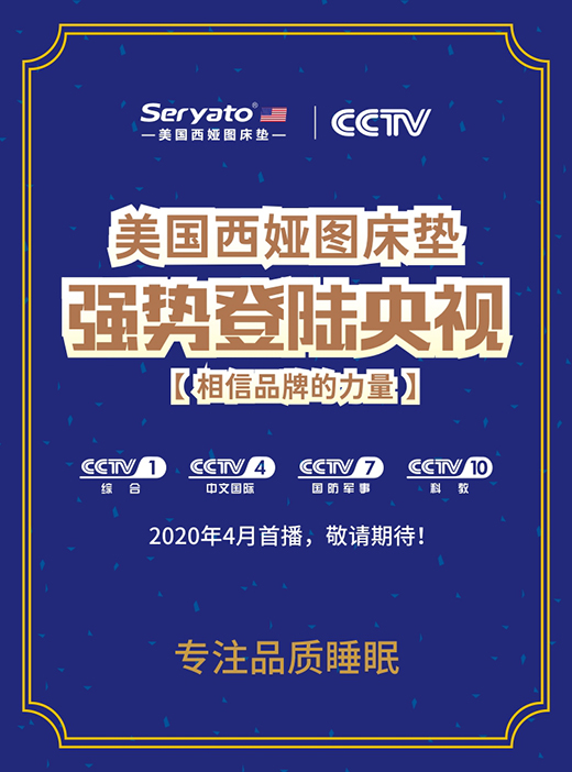 2020年4月29日,Seryato西婭圖品牌將以國際視野開啟品牌、產(chǎn)品全面升級的序幕,成功簽約中國CCTV-1、CCTV-4、CCTV-7、CCTV-10頻道,向全球消費者傳遞Seryato西婭圖卓越的品牌價值。