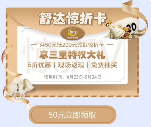 只要50元,就能領(lǐng)取價(jià)值200元的驚折卡。持卡才能擁有驚折活動(dòng)5折購(gòu)買床墊的權(quán)限哦。還能在活動(dòng)落地當(dāng)天(5月24日)享受返現(xiàn)補(bǔ)貼和現(xiàn)場(chǎng)抽獎(jiǎng)。