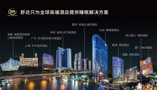 在中國,已有500多家五星級及度假型、輕奢型酒店選擇舒達床墊,其中包含上海外灘華爾道夫、北京康萊德、深圳華僑城洲際、武漢卓爾萬豪、杭州希爾頓嘉悅里、重慶來福士洲際等地標性酒店。舒達床墊致力為賓客帶來更舒適的睡眠體驗,每年越來越多的高端酒店選用舒達。