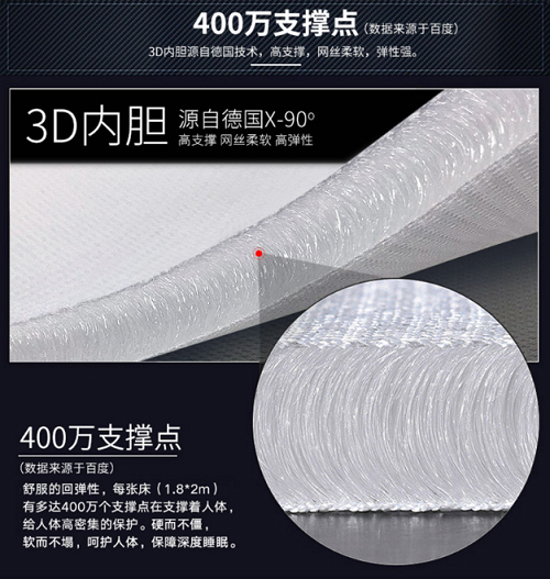 3D(3-Dimenshional,中空立體)材質(zhì),是一種透氣性強(qiáng)、彈性,支撐性都很出色的新型純織物材料。目前在床墊、枕頭等需要具有良好彈性、透氣性行業(yè)里廣泛使用。