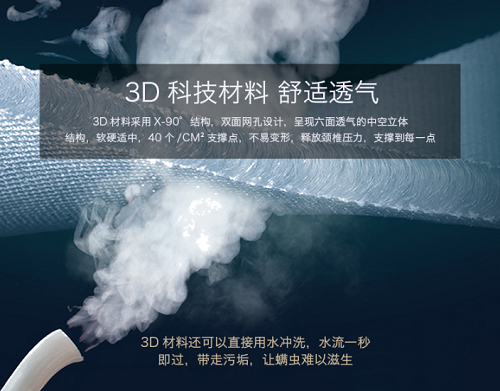 3D采用“X-90°”結(jié)構(gòu),雙面網(wǎng)孔,呈現(xiàn)六面透氣中空立體的結(jié)構(gòu),軟硬適中,40個(gè)/CM2支撐點(diǎn),有效釋放頸椎壓力,撐托到每一點(diǎn)。
