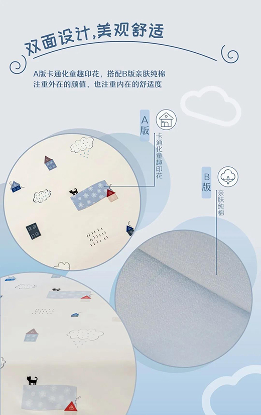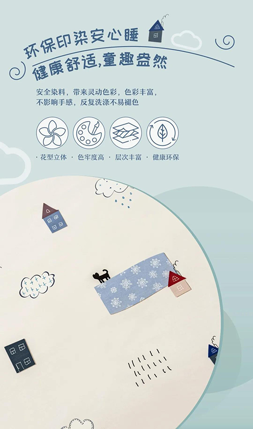 全棉纖維紡織品根據(jù)棉花的種類和品質(zhì)、工藝的差異等,又分為普通純棉、絲光棉、匹馬棉等、陽(yáng)光棉等。 陽(yáng)光棉是錦葵科、棉屬種質(zhì),原產(chǎn)地在美國(guó),通常享受較長(zhǎng)的日光照射,棉花纖維絲具有光亮葉雜少、棉質(zhì)細(xì)膩、柔韌等突出優(yōu)勢(shì)。陽(yáng)光棉在化妝棉、嬰幼兒衣物等領(lǐng)域的應(yīng)用較為普遍,不易變形、不傷皮膚。雅蘭“趣味小鎮(zhèn)”四件套使用的,正是陽(yáng)光棉。