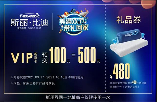 只要在斯麗比迪【一家好店】線上購買VIP尊享卡,即可享100元抵500元,尊享推薦正特價產(chǎn)品鉅惠購買資格,到店還可獲價值480元斯麗比迪隨心睡抱抱枕1個及精美禮品1份,福利大派送,驚喜享不停!