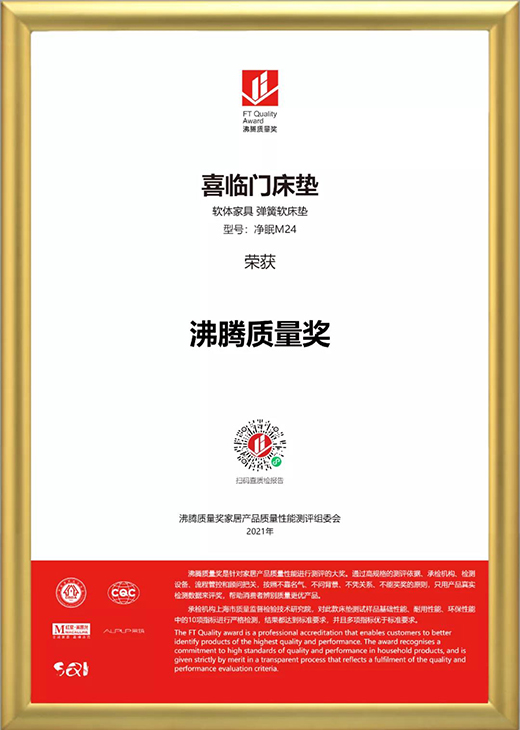 近日,被譽為“家居質量界奧斯卡”的沸騰質量獎重磅公布,喜臨門凈眠M24彈簧軟床墊憑借硬核產(chǎn)品品質和卓越專業(yè)的技術實力,在眾多參評產(chǎn)品中脫穎而出,斬獲2021年沸騰質量獎,獲得權威機構的高度評價。