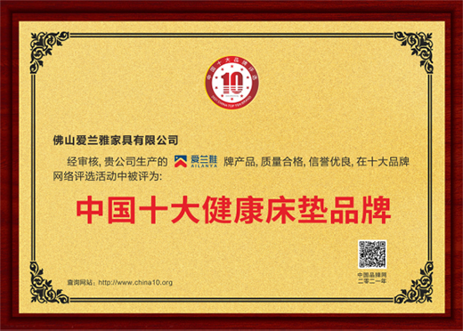 愛蘭雅在床墊品牌中排名前十,是“中國十大健康床墊品牌”。