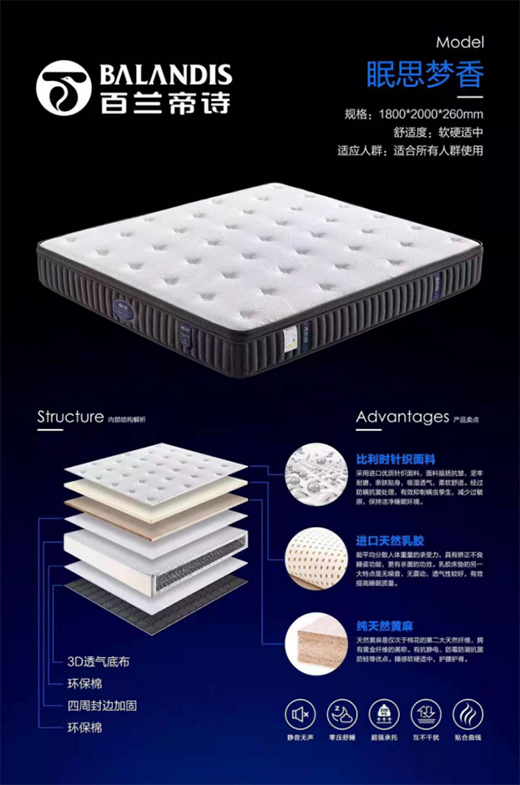 百蘭帝詩(shī)家居是一個(gè)極具創(chuàng)造力和創(chuàng)新能力的企業(yè),創(chuàng)新是深入骨髓的企業(yè)基因,每一個(gè)百蘭帝詩(shī)人都有非常強(qiáng)的創(chuàng)造力和創(chuàng)新力。百蘭帝詩(shī)人非常注重產(chǎn)品的設(shè)計(jì)風(fēng)格、款式及品牌的獨(dú)特性,融合古典與前衛(wèi)、現(xiàn)代與時(shí)尚、生活與情趣,旨在用全新的設(shè)計(jì)思維和以人為本的理念去打造生活的藝術(shù)。2022年,百蘭帝詩(shī)家居推出的眠思?jí)羿l(xiāng)系列,就是針對(duì)深睡眠的5大維度優(yōu)勢(shì)(貼合感、接觸柔軟感、適溫感、干爽感、安全感),精選比利時(shí)針織面料、進(jìn)口天然乳膠、純天然黃麻等原材料制作形成全方位的零感深睡體驗(yàn),倡導(dǎo)人們回歸睡眠本質(zhì),讓身體得到大滿足。