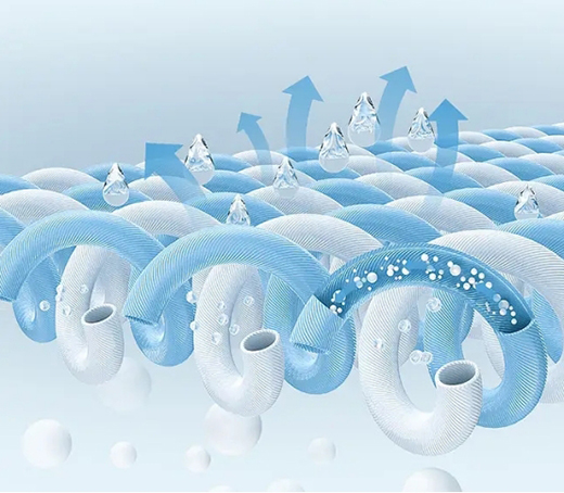 它通過獨(dú)特的四孔纖維結(jié)構(gòu),構(gòu)建出水汽循環(huán)對(duì)流,四面環(huán)氧,舒爽透氣。并且經(jīng)過COOLFX技術(shù)處理,利用纖維的溝槽產(chǎn)生虹吸作用,可以帶動(dòng)肌膚表面的水分快速擴(kuò)散,吸收汗液水分,排濕散熱速度更快,促進(jìn)人體自然的溫度調(diào)節(jié),使肌膚始終保持干爽舒適。