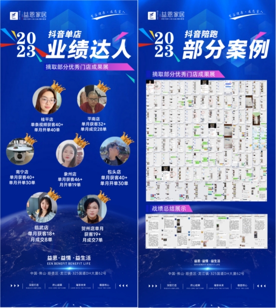 2023年以來(lái),益恩家居總部開(kāi)展了“抖音同城長(zhǎng)期陪跑班”培訓(xùn),活動(dòng)開(kāi)展以來(lái)取得了巨大成效。因此,在此次展會(huì)上益恩家居展示了眾多經(jīng)銷(xiāo)商抖音賦能的成功案例。這些成功案例不僅展示了益恩家居與經(jīng)銷(xiāo)商的合作成果,也為其他經(jīng)銷(xiāo)商提供了寶貴的經(jīng)驗(yàn)和啟示。