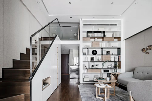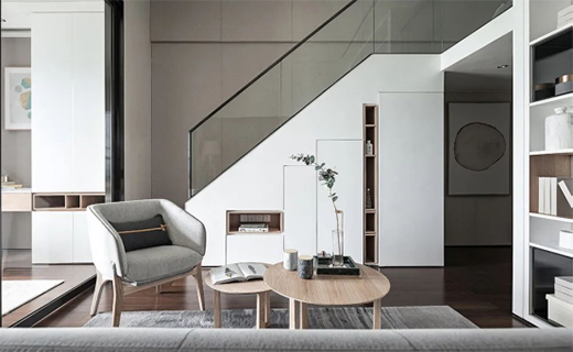 沙發(fā)對面的電視墻被簡鉆家居巧妙設(shè)計為樓梯,后方空間都做成收納柜,樓梯、收納兩不誤,保持簡潔大方的基礎(chǔ),又提升了空間的儲物功能。而沙發(fā)旁邊的墻面做成書架,擺上書籍、陶藝品和金屬擺件,提升了空間的藝術(shù)與精致感。
