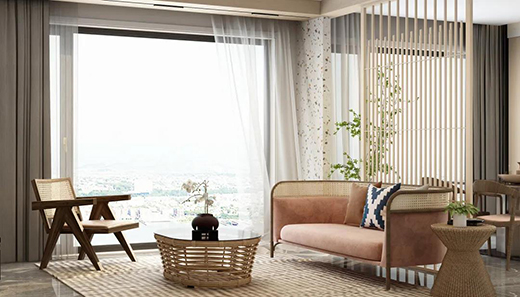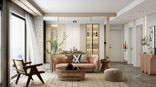 從玄關(guān)步入室內(nèi),大面積木飾面的裝修設(shè)計賦予空間極大的侘寂感,日系屏風(fēng)極具特色,簡約具有設(shè)計感的線條、藤編的茶幾營造出空靈、自然、愜意的氛圍。