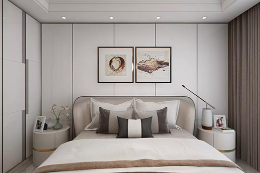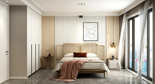 臥室用色統(tǒng)一、簡約大氣,原始材質(zhì)的家具讓生活回歸純真簡約。日系燈光輕易便營造出自然氛圍。床頭從幾何線條和自然元素中汲取靈感,不經(jīng)意間流露出簡約之美。