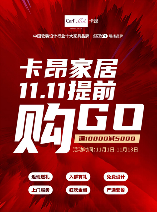 10月31日晚8點(diǎn),隨著京東、天貓開啟尾款支付,雙十一購物狂歡節(jié)正式打響!為回饋廣大忠實(shí)客戶,卡昂家居于11月1日-11月13日重磅開啟“11.11提前購go,滿10000減5000”的大促狂歡活動(dòng),豐富的優(yōu)惠政策、高顏高質(zhì)的產(chǎn)品矩陣、海量家居福利,為消費(fèi)者打造一場別具一格的家居鉅惠盛典!