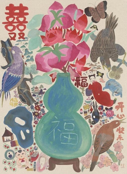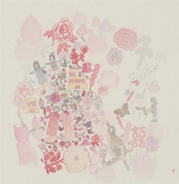 在藝術(shù)家王濛莎的作品中,有著多重平行宇宙:蠟筆小新、櫻桃小丸子、葫蘆娃、摩登女郎、江湖俠女,民俗圖案、繡片紋樣、民窯瓷畫;文人畫的手法、波普的色彩……看似風(fēng)馬牛不相及的元素,經(jīng)由蒙太奇式的手法,被織成了一張文化巨網(wǎng):東方與西方、傳統(tǒng)與當(dāng)代、現(xiàn)實(shí)與幻境相互交織,時(shí)空幻化、主觀位移,還原著王濛莎精神世界的生成史,也構(gòu)建起她獨(dú)有的圖像宇宙。
