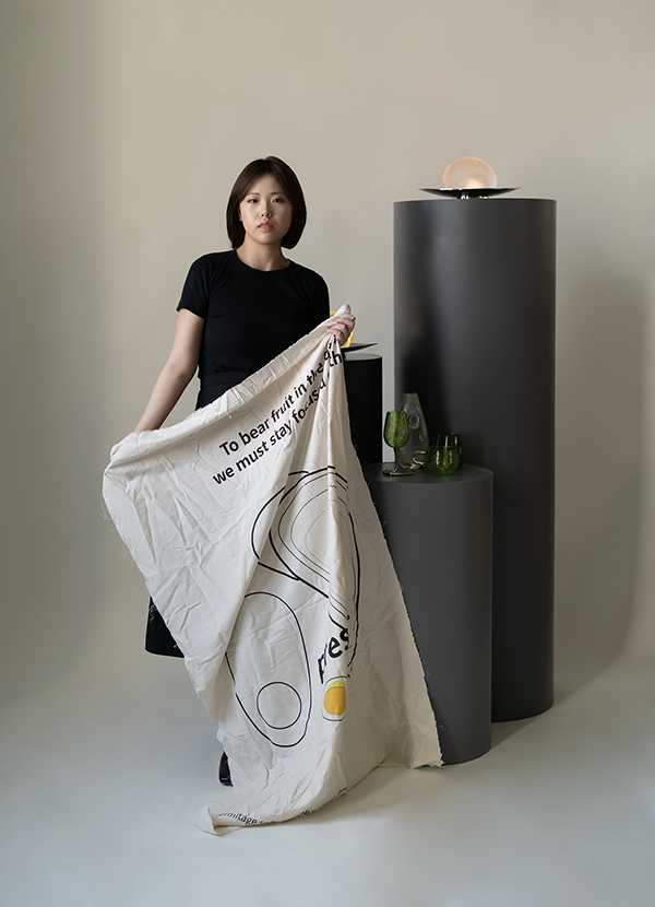 關(guān)于"檸檬"系列的設(shè)計(jì)靈感,逯童琦說:”檸檬燈的創(chuàng)作過程,是一個(gè)去重新尋找和大自然鏈接的過程。當(dāng)時(shí),正是疫情爆發(fā)后的隔離時(shí)期,人們面對著不確定、以及突如其來的生活環(huán)境變化,焦慮擔(dān)憂的情緒充斥著原本繁忙朝氣的城市 生活。我坐在后院,思考著、擔(dān)憂著自己的計(jì)劃和工作,突然被一聲“咚”打破了思緒,回過頭看到一個(gè)檸檬果從樹上掉落向我滾來。柔軟的果肉、不規(guī)則的檸檬果子和土地柔軟的落地接觸,頓時(shí)給我?guī)砹遂`感?!?/p>