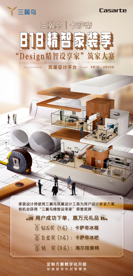 為了廣泛發(fā)掘更有潛力的設(shè)計(jì)師,為他們提供一個(gè)展露風(fēng)采的平臺。8月1日,三翼鳥聯(lián)合設(shè)計(jì)工作室、家裝公司等共同發(fā)起三翼鳥|卡薩帝818精智家裝季#Design精智設(shè)享家#筑家大賽,開啟“設(shè)計(jì)師合伙人”招募。