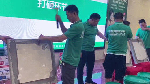 為了體驗(yàn)億固瓷磚膠品質(zhì),特意設(shè)置了打砸環(huán)節(jié)。隨著主持人的一聲令下:開(kāi)始!幾位師傅掄起鐵錘撬鑿捶打,毫不留情地打砸用億固瓷磚膠鋪貼好的瓷磚。