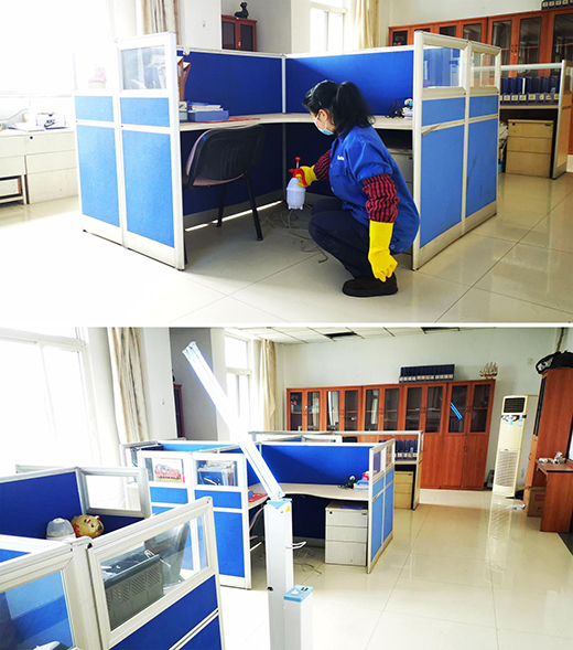 辦公室里,保潔阿姨正拿著84消毒液為我們進(jìn)行辦公室消毒。將消毒液噴灑于桌面、桌底、椅子、擋板……做到每個(gè)角落都不放過,隨后架起紫外線消毒燈,雙重消毒下,讓病菌無處藏匿!