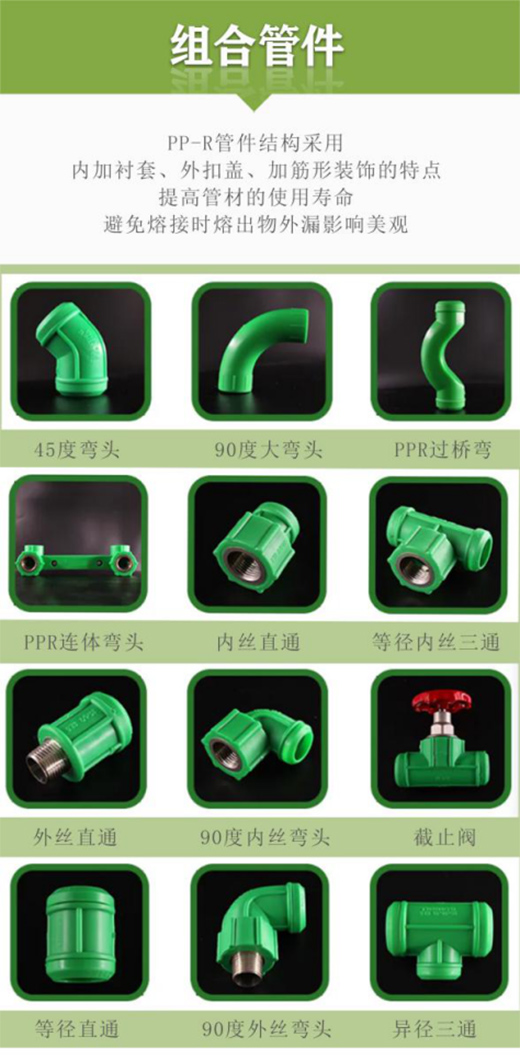 PP-R管件結(jié)構(gòu)采用內(nèi)加襯套、外扣蓋、加強(qiáng)筋形裝飾的特點(diǎn),提高管材的使用壽命,避免熔接時(shí)熔出物外漏影響美觀。